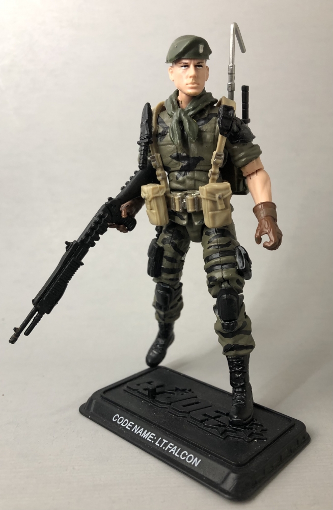 Falcon. I chose the Tatum head for the youthful appearance. It never dawned on me until I made Recondo last spring that instead of eyeballing camo patterns and not being happy with it, I should just mimic the ARAH figures pattern. So I copied the ARAH Falcon as much as I could, and scavenged some parts off my old Falcon custom as well. The camo Should have been a no brainer in the last 20 years of doing this, but it never crossed my mind.