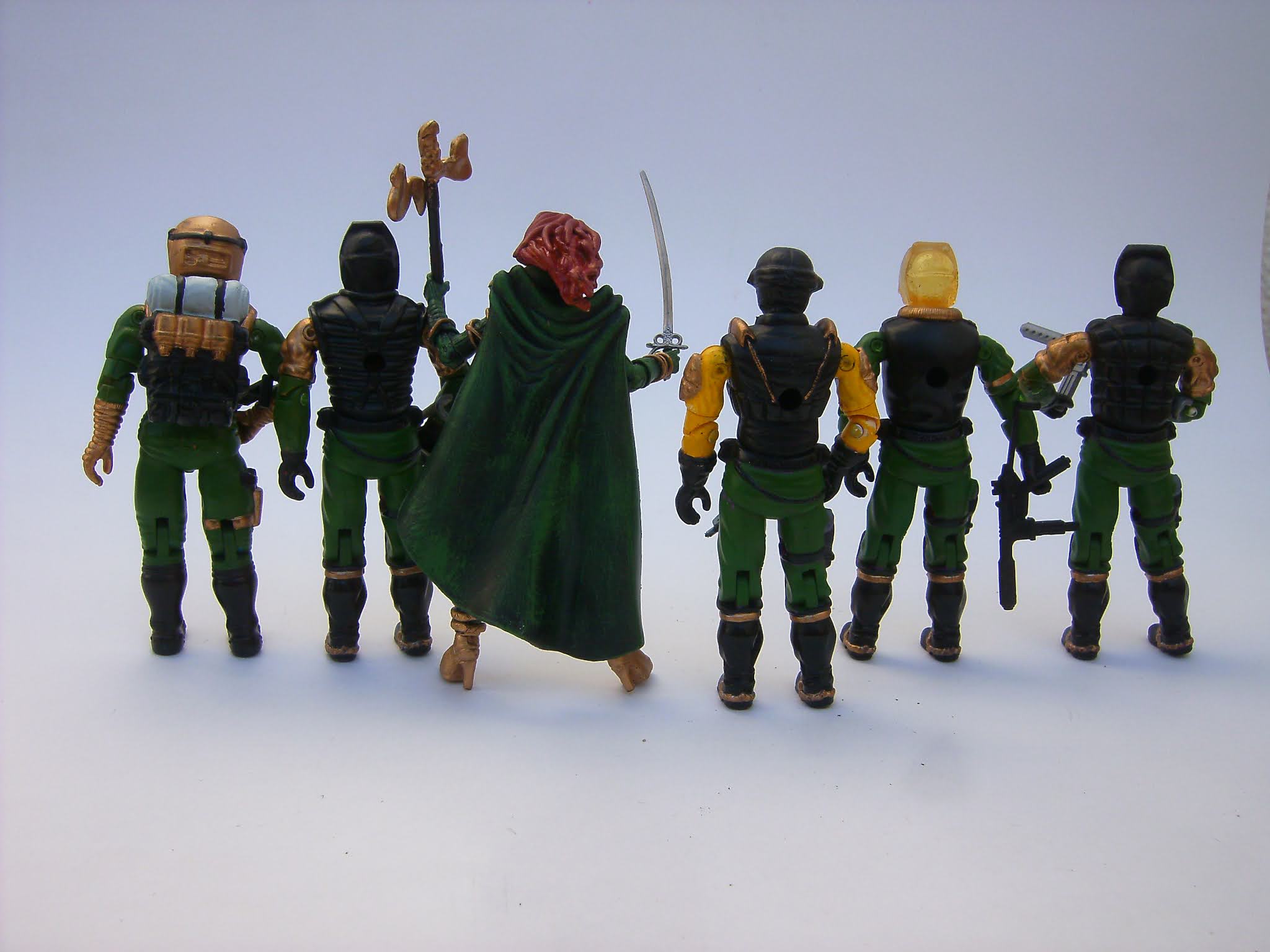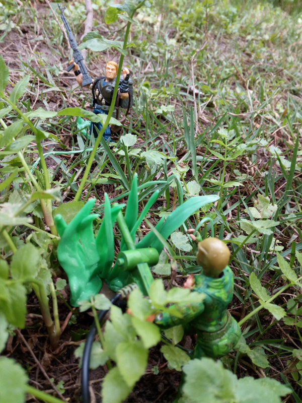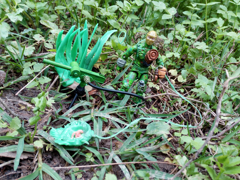 . He comes with false plant camouflage, automatic cannon, and dna-altered carnivorous plant he uses as trap. Sculpted within him is sound system on his chest, to confuse enemy with various sounds, and hand flamethrower. Inspired by the early 90s Joe figures that came with all sorts of large accesories, like Incinerator, Firefly, Cobra commander with his plane, etc.