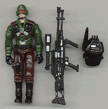 Heavy Machine Gunner by Chris Parts used: Bio: Willy Sullivan joined the G.I.Joe resistance after his father was Executed by Cobra Inc for the Unauthorized use of a medical Procedure, Specifically the ocular Implants he used to let Willy see again. Truly his fathers son, he is a Technological genius and shown this skill by augmenting weapons he found in the Pit beyond their original parameters. He enhanced a Helmet with Zero sight Echo Location Targeting that links directly into his Ocular Implants, along with a brain-linked satellite communication array, and a small Micro-Disk player, and enhanced the scope on a machine gun with a link-up to his optic sensors, along with an enhanced ammunition capability. |