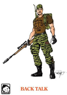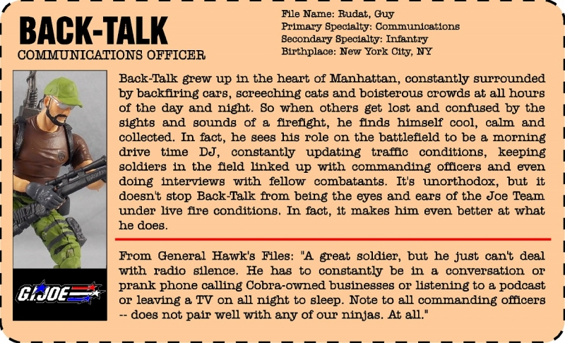 After making Rook, I set my sights on Back-Talk. Despite the fact that I find his look a bit unremarkable next to the other members of the squad, I wanted to continue building the team. Also, I wanted a figure to include with the HQ. A communications specialist made perfect sense. I spiced him up with a decal for his shirt and a spiffy detailed backpack. Thanks to Sam Panico for the filecard.