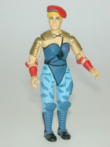 However, I decided to do my own Cammy, and I realized it would be easy enough to do her with a Ninja Force Scarlett. I admit the uniform colors, especially the legs, were heavily influenced by the movie, but I tend to think that this might be how Hasbro might have done the figure, as well. The beret was made with resin modeling putty. I never got around to giving her the trademark braids. The plan was to trim the braids from a couple of movie Vega figures and attach them, but I could never find the figures, and I wasn't really sure how to go about attaching them effectively. Otherwise, I think the figure looks pretty good. I hope you like CAMMY!