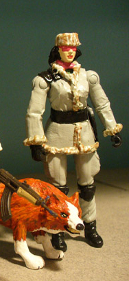 In the Sunbow appearance, Daina wore a hot pink Santa Claus snow suit. Uh, no thanks. I had to keep some representation of the pink, so I painted the Baroness glasses as sunglasses. The scarf around the neck is also pink. Otherwise I simply substituted light grey for what had been hot pink in the cartoon. I've sculpted fur onto other figures before, such as my Dela Eden custom, but I took a different painting approach on this figure. Instead of using a wash, on this one I added in different colors/brush strokes to give the fur a more realistic feel.