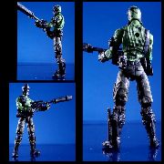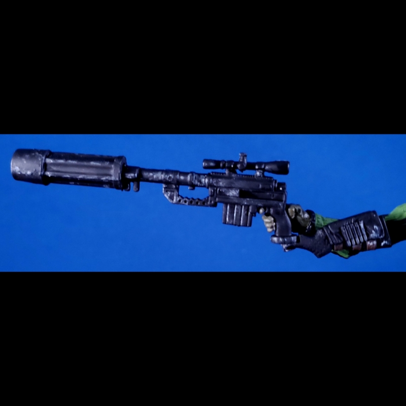 The ribbed sweater that we got for so many Pursuit of Cobra figures was perfect from the start and something many other customizers used. I bought a casted head from this custom probably about 4 years ago. I sculpted a few extra harness details, communicator on left wrist, and other minor odds and ends and called it a day...for the figure. His gun was another matter. I had considered just buying a vintage gun but in looking through my fodder of weapons and parts I felt I could make something updated that still called on the original weapon-which I felt look a little too plain for what I was going for. I measured out the parts and was very happy with how his gun ended up coming together. Some crazy glue, a tack, and paint and Darklon had his updated weapon for the 21st Century.