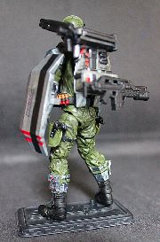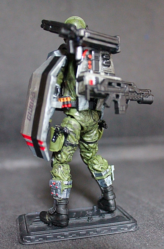 I added the blank MTF tabs to the backpack and was able to slide the pulse rifle onto them. The shield fits snug on the cannon when in a downward position, allowing Eagle Eye to carry all his gear at once.