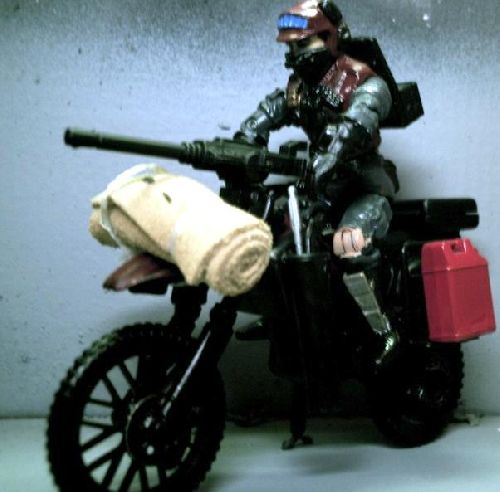 A trained survivalist, ex-combat journalist, an accomplished moto-cross racer ( he even tried the Baja 1000 but got stuck in the silt), expert in covert operations and stealth. Exodus works alone and a night. His helmet is equipped with a blue light L.E.D. Payments for his service are sent by Ripper to a unnamed Swiss account. It is rumored that Exodus' actually GI Joe's very own Scoop, but that can not be confirmed.