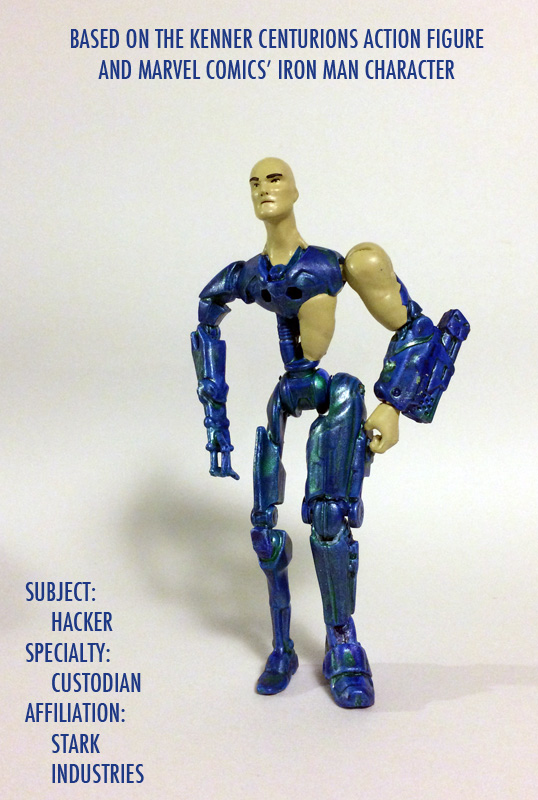 Like my Doc Terror custom, here I'm re-imagining Hacker from the Centurions toy line as a "Now a Joe" character. He's not a villain, but a poor custodian at Stark Industries forced to wear partial Centurions armor following a devastating janitorial mishap. Probably the same one that injured Doc Terror, since Hacker's limbs are a reversal of Doc Terror's. Hacker's totally destroyed arm and leg are replaced with wiry robotic parts supplied by Star Wars figures.