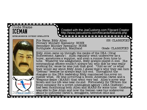 Eddy Allen came up through the ranks of the DEA (Drug Enforcement Agency), after serving in the narcotics division of D.C.'s finest. Allen regularly went undercover as a buyer, sometimes a supplier, and even a runner from time to time. Whatever the assignment, Eddy always played it cool. His commanding officers couldn't always tell who side he was really working for, cause he was just that good. "Cold as ice" is what they would say about Eddy Allen I guess that's why they call him "Iceman" because he always kept his cool. Throughout the changes in the DEA leadership Eddy maintained his cover no matter what. Until the last mission he was involving a South American Cartel and a Weapons dealer (MARS) that went very bad. Allen's cover was blown and his life was near its end at the hands of the weapons dealer and his small army. Fortunately for TECcom the front company for a covert intelligence agency (AKA Oneforce) had been monitoring both Allen and MARS for some time. Oneforce was able to free Allen and give him a new home and a new mission leaving the DEA and the Government behind. Now the Iceman uses his undercover skills to infiltrate Cartel's, smugglers, terrorist cells and even the Dreadnok's.