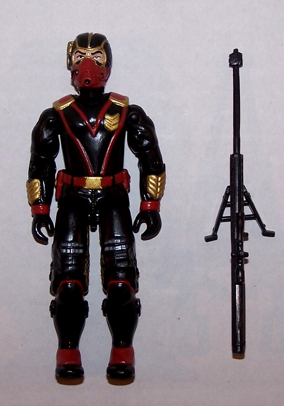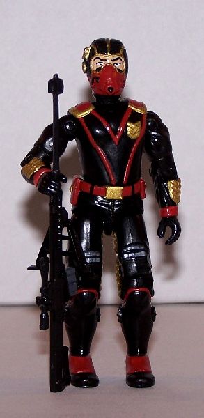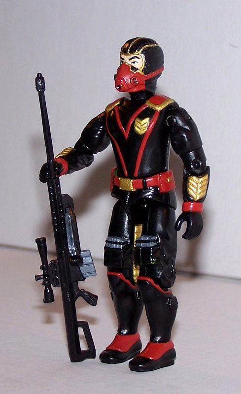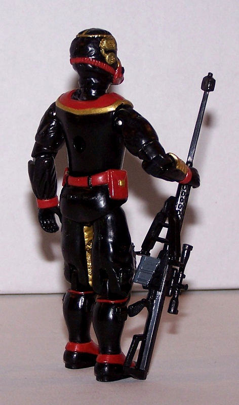 The head for this figure was custom-sculpted as a sniper for the Iron Grenadiers, and finally got around to finishing the figure. The pieces were selected because they had similar elements to them. The torso isn't even GI Joe, but the chevrons on the chest match up with elements on the arm. I used Sci-Fi's legs since the power packs on his legs look like they could be .50 BMG magazines. Everything got coated in Model Master flat black acrylic paint, with details painted in the red and gold of the Iron Grenadiers.