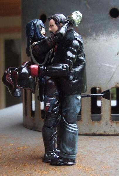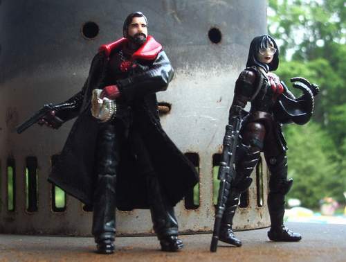 Now the two lovebirds are together in agreeable figures ^_^ I really wanted to make a Destro with a normal face, for business transactions/snogging, and Obi-Wan looked both intelligent and slightly annoyed, which works well with the new-sculpt Destro head. The necks are ball-jointed, so the heads pop on and off, but I couldn't get good pictures with the mask on. Stupid chrome! Of course, any Destro couldn't be without wrist-rockets. Anyway, hope you like~