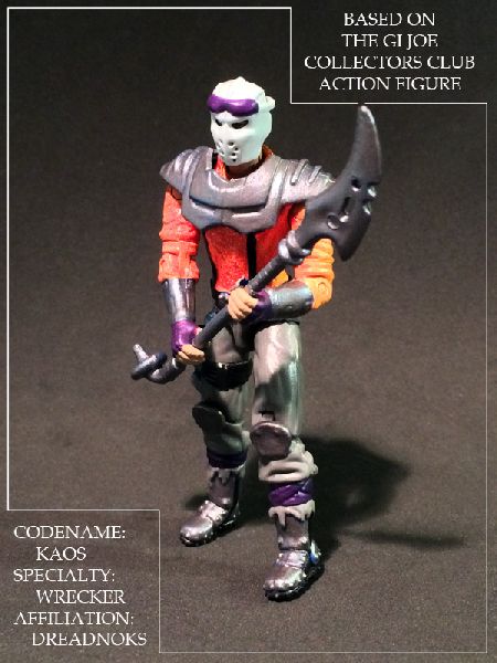 The GI Joe Collectors' Club took a Hasbro troop builder concept, but released it as an individual "named" character, Dreadnok Kaos. The problem with the character, as an individual or as a troop builder, is the hockey mask (which I lazily replaced with a snow mask). Dreadnoks are so anti-social that they even don't bother to conceal their identities. A Dreadnok concealing his identity runs counter to the entire concept of the biker gang identity- at least within a GI Joe context.