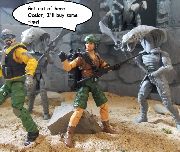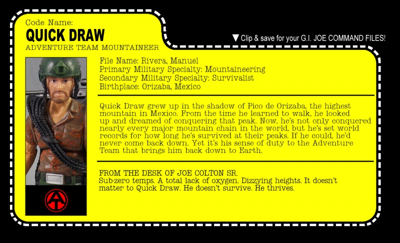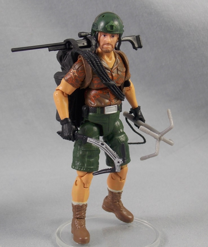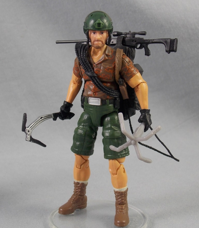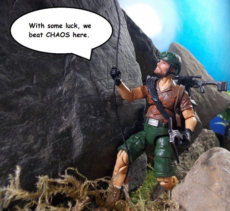 The swamp boat never got finished, so when we started putting the whole project together, the swamp setting was changed to a mountain mission. I decided to re-purpose Crayfish. I swapped his boonie hat for a climbing helmet and he got some new gear. He became Quickdraw, the Mountain Adventurer.