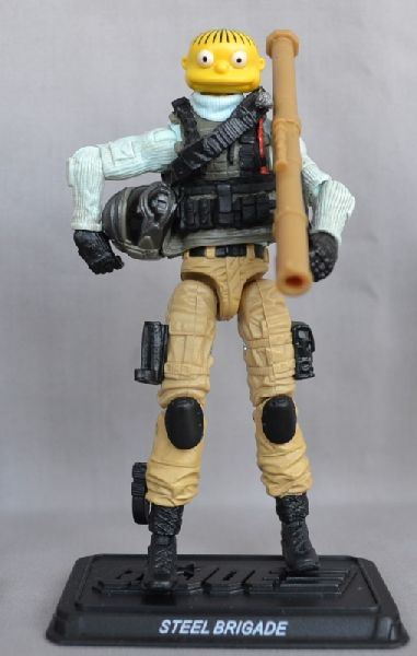 Ralph was a difficult placement for the top brass at GI Joe. With his father Chief Wiggum already in the ranks, they really couldn't say no even though he failed every test with flying colors. He ended up with the Steel Brigade squad mainly so that the other members could keep an eye on him. During weapons training he answered every question with: