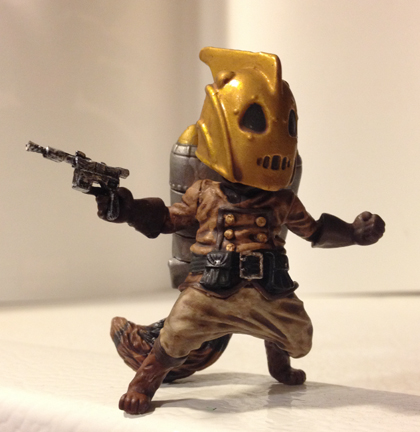 The Racketeer is a raccoon that survived MARS pre-venomization lab studies. After gaining near human-level intelligence, Subject #10-8 (nickname : Rocket) escaped and took it upon himself to bring the villainous MARS and the evil Dr. Mindbender down. Utilizing a prototype JUMP that he designed himself, he leads a scraggly band of do-gooders against the mighty fortress Castle Destro.