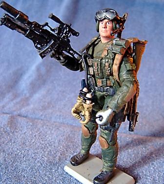 As you can see from the front view, he has an extra pair of gloves for "Fast-roping" out of helocopters straight onto the decks of ships. From the back you can see his radio, canteen, jump kit and on his hip the holster for his palm top computer. You can also see the D-ring for his harness used for extracation from ships via helocopter. They clip into a rope hanging from a chopper and are flown off just hanging from the rope. Quite a site.