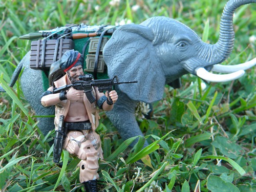 This is now my 5th custom. I had bought an extra Chief Guard on ebay, and was going to use his head as some sort of villain. Unfortunately it was way to large for the figures I wanted to use it on. Plan B was to meld it with a Joe figure, and I found a tutorial on how to combine the 2 styles of bodies. Rather than make him a villain, I decided that diversity was in order, and that what would be more diversified than a Sikh soldier. A little research and viola, Rama was born. I thought he looked lonely, so I bought the elephant as his sidekick and decked him out with gear as well. This one was probably the hardest one I have done so far with trying to get all the pieces to fit together.
