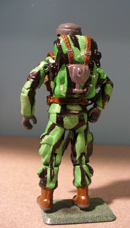 The uniform has two-tone camo pattern, using vertical shapes. There is more contrast between the two colors here than I usually put into camo patterns.