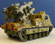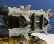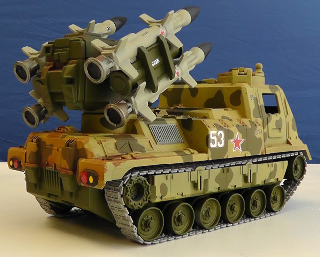This is a custom Soviet themed Rocket Launching vehicle, or MLRS. MLRS stands for Multi-Launch Rocket System. It has been painted with a realistic paint job inspired by Soviet camo paint schemes, had detailed decals applied, and has had lifelike weathering added. The cabin has room for a crew of two figures, the missile rack can be posed, and the treads flex. It would fit in nicely with an Oktober Guard setup.