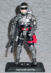 As Destro's engineers began their task he searched the ranks of his Iron Grenadiers for a volunteer. It had to be one who possessed leadership skills and was a loyal soldier. As if put in place by fate, about the time that the engineers had designed a well functioning system, an Iron Grenadier Lieutenant was attacked by several of Croc Masters pets. In spite of the IG armor, the young Lieutenant was on the brink of death. The crocs had torn off his arms and legs and had severely maimed his remaining body. He was offered a chance to become whole again. Not just whole, but super-humanly powerful. His mechanical limbs, electronic implants, and armor for his remaining humanity were made from an ultra-hard, yet light weight titanium alloy. It was even used to reinforce his remaining bone structure. He was also injected with performance-enhancing muscle amplifying chemicals to make his remaining living tissue strong and durable. He's like something out of a comic book or movie, a "Sci-Fi" comic or movie. Therefore deemed Sci-Fi by Destro.