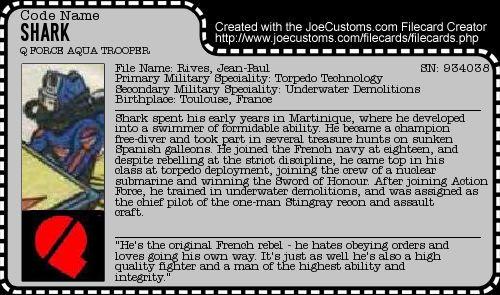 I never much cared for Shark; maybe it was something to do with his being French. Actually, I'm just not that keen on frogmen and divers in general. I quite like the other parts of Q Force, such as Phones or Surfer, but the original Shark figure, with his very odd airtank design, just really irritated me. Anyway, enough of my own personal prejudices, when it came to the custom version, I was feeling lazy, I had a spare Wet Suit, and so I just painted him up in Q Force colours.
