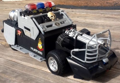 Thrasher loved his Thunder Machine, but dissatisfied with the colors, he decided a trip back into the Dreadnok chop shop was in order. He wanted it's appearance to be more intimidating, something that would convey at a glance that, "This is a serious threat and you should be running." After some debate he decided that Flat Black, with battleship grey would be more to his liking and adding a human skull he found in the swamp would let folks know he meant business. "Now all I need are some 'Joes' to cross my path he smirked to himself as the paint fumes settled, "and I'll have some new skulls to add."
