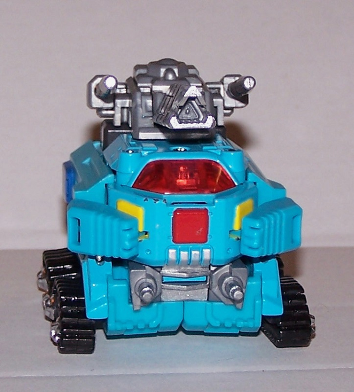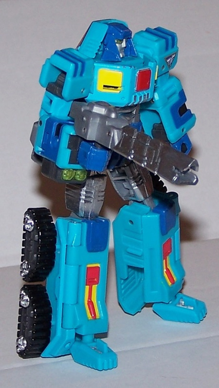 If you're going to do custom Transformers, you might as well do some GoBots as well, right? This figure comes from Action Toys' Machine Robo line, producing classic GoBots in modern form, including some die-cast metal parts. Tank here is a chunky beast, as he should be. He gets some chrome and some dark blue highlights, to bring his colours closer to the original, and the treads are painted black to give more variety to those parts.