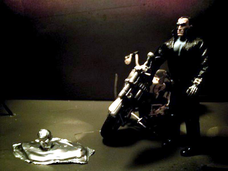 I had always enjoyed the Terminator films and had wanted to make my own Terminator. When I was at JoeCon 08 ( I was the guy dressed as Ripper ) I purchased a leather coat from UrbanRev and a Kano from Joe Armory. It took some time getting Kano's melon to fit Road Pig's torso but it looks okay. I used Destro's arm because it looked almost mechanical ( I used up all of my BAT arms on my Skorpions) . I decided to give Arnie the grenade launcher similar to the one in the scene in front of Cyberdyne Systems office. For the T1000, I wanted a simple morphing from liquid to man.