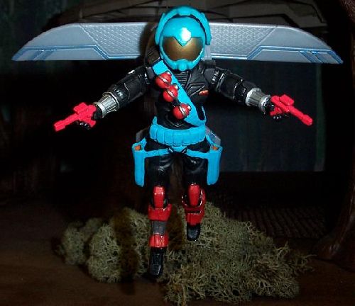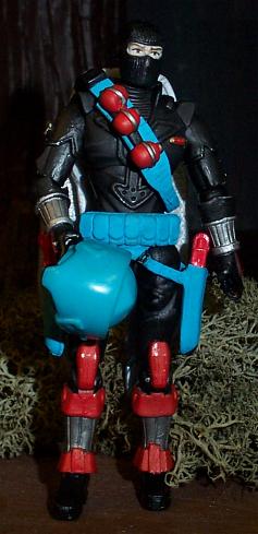 T.A.R.G.A.T. stands for Trans-Atmospheric Rapid Global Assault Trooper. The theory was that these guys are deployed into orbit from a space shuttle. On cue, they drop like a meteor shower onto their unsuspecting prey. I always thought this was a pretty cool concept. The entire body came from the Battle Armor Cobra Commander figure. In this case, I even kept the head. The vintage T.A.R.G.A.T. head was hollowed out with the Dremel until it fit the figure's head properly. This was a particularly agonizing process because I had to go to within 1/16 of an inch of the helmet's surface in order to get it to fit. The whole time, I was afraid I'd punch through and render the helmet useless (although I would find out that this was nothing compared to the next figure I did). Once the helmet was done, it was a simple matter of choosing accessories and painting. I thought that he needed some weapons that would pack a punch, but could be easily stowed while he was doing his meteor impersonation. I decided to give him a pair of the pistols that came with the regular IG troopers holstered in a dual rig that came from a Star Wars Fenn Shysa figure. The original T.A.R.G.A.T. had grenades on a belt around his waist, so I wanted to give him something reminiscent of that. The bandolier came from RoC Monkeywrench. The flight pack came from the RoC General Hawk figure. When I started painting, I wanted to keep within the spirit of the classic character, so it was off to the store for some turquoise paint! After everything was finished, I gave him a light application of Testors Dull-Cote.