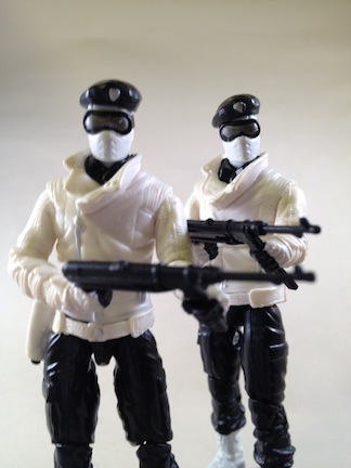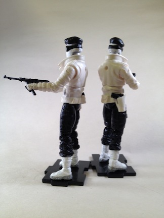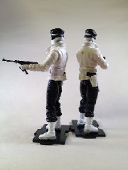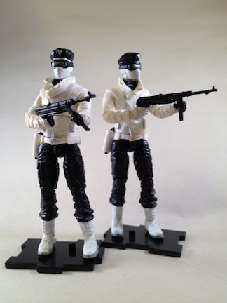 These customs came about as one day I was looking at the awesome Storm Shadow leather jacket & popped a Snake Eyes head on it. Immediately I realized it looked like that old Captain America comics villain: ULTIMATUM (Underground Liberated Totally Integrated Mobile Army To Unite Mankind.) I hit HypnoHustler up for the necessary parts to finish these customs, as well as getting some berets and guns from Marauder John at this year's GIJCC convention. I also got some advice from Chief for how to paint the boots -- thanks everyone for all your help, I'm very happy with how these (pretty simple) customs turned out!