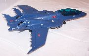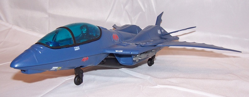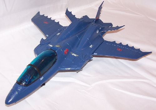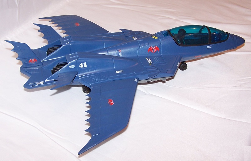 The Cobra Vampire is loosely inspired by Serpentor's plane shown in GI Joe and the Transformers issues 3 and 4. The bat wings on this plane led me to seek out a Batplane model in a sufficient scale to use for a Joe vehicle, and I was able to find a Polar Lights model kit from 2002 online. That gave me the nice bat wings, but I still had to figure out exactly how to use them. I had a old beat-up Storm Eagle that had several things wrong with it, so I started chopping off bits of it and figuring out how and where to add the wings to make it work. And this is what I came up with. I painted the water-gun handle black so it can function as a conformal fuel tank, and painted the plane itself a nice muted blue colour so that it wouldn't look too much like the Batplane.