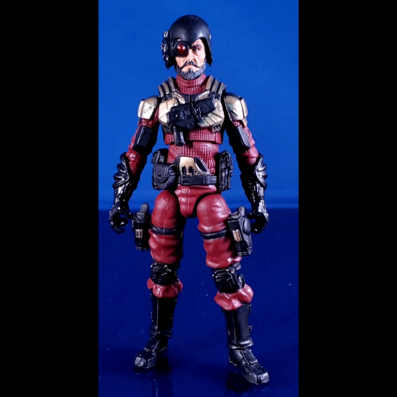 I know I know. Everyone hates Voltar. I don't. I remember playing Contra on the NES when this figure came out and for some reason I felt he fit in perfectly with that game, that along with the copious amounts of Star Trek The Next Generation I was watching at that time during it's second season I saw Voltar as a Contra/Star Trek hybrid character. As I went about coming up with build ideas for this figure I realized that certain elements of the character were not working for me. The overly complex helmet and fins didn't work for me. I felt that instead of looking like a General he came across to me as a circus character. Thankfully my casted helmet (that I got years ago shrunk in size and broke), therefore I went about thinking of how I would re-design his helmet to something more fitting of a General. I kept the overall shape and the bit of tech which always screamed "Voltar" to me, and that was the eye magnifier. That began to give me ideas about his overall uniform and I wanted him "plated up' with various armor but his confidence and arrogance would not allow him to "hide" in camo, so I went about coming up with a color red/purple/violet that worked for me. There have been some really awesome customs of Voltar and I definitely borrowed bits and pieces from those that inspired me here. I did like the idea of him keeping his gold armor but also wanted to mix it in with black and just put the gold on various bits to showcase that Voltar egalitarian attitude. Finally unlike my custom Scoop I considered designing a new backpack for him but took another look at the vintage and picked one up for cheap on ebay. Just adjusted the peg hole to fit modern figures and moved it up to fit the new figure. I decided to drop his "bird" and instead felt that his backpack is truly for communication to be able to control his army of Iron Grenadiers remotely regardless of the challenges on the field.