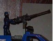 A Corps! field transport painted blue. I used some of the stickers from the truck (the numbers) and hodge-podged some Cobra sigils on it. The pintle mount is a plastic coat hanger, and the .50 cal is from a Soldier Force vehicle.