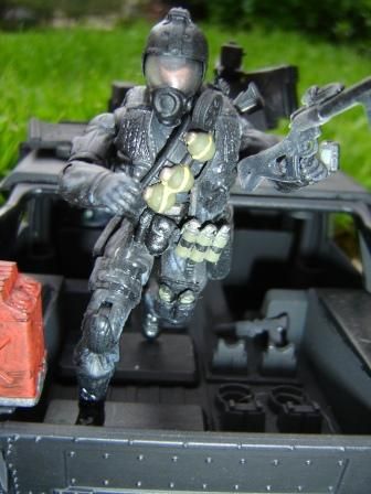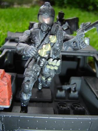 The gas mask and helmet are removable, as are the bandoleer and vest. There is a pouch on his left leg that holds two grenades, which are removable. His pistol is removable from the holster. The sling on his back will hold either the grenade launcher or the M-16, and of course the wrist top communicator flips up.