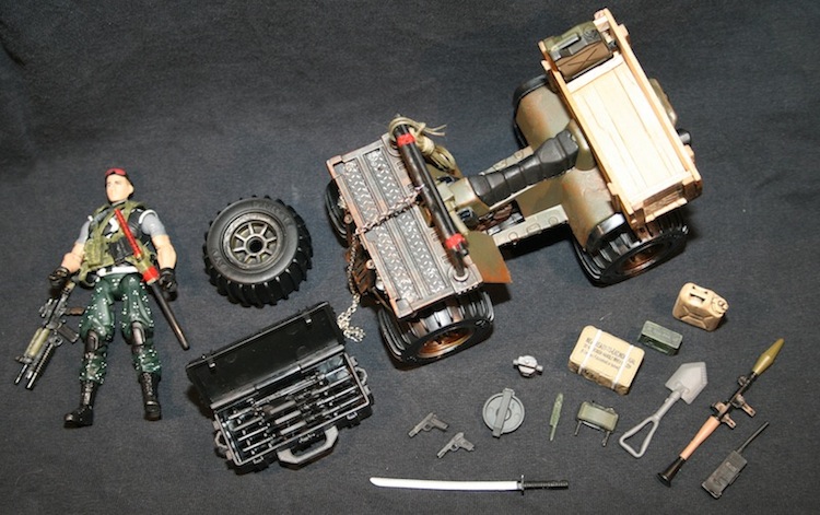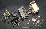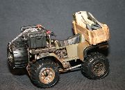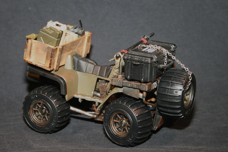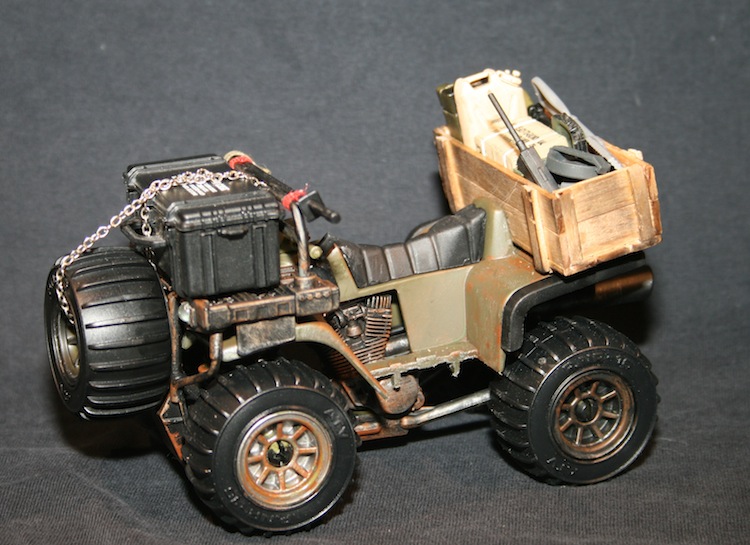 Ronin is a survivor. As a Joe he has trained all around the world and looked the Grim Reaper in the eye and laughed. He grabbed his quad, his gear, and his katana and took for the hills. He carries all he needs for survival and then some; water, gas, MREs, shovel, camp stove and frying pan, radio, spare tire, and lots of weaponry. He had switched the front headlamps from white bulbs to red to help with night riding. From ammo cans to RPGs, katanas to rifles aplenty Ronin is ready for what ever is thrown at him.