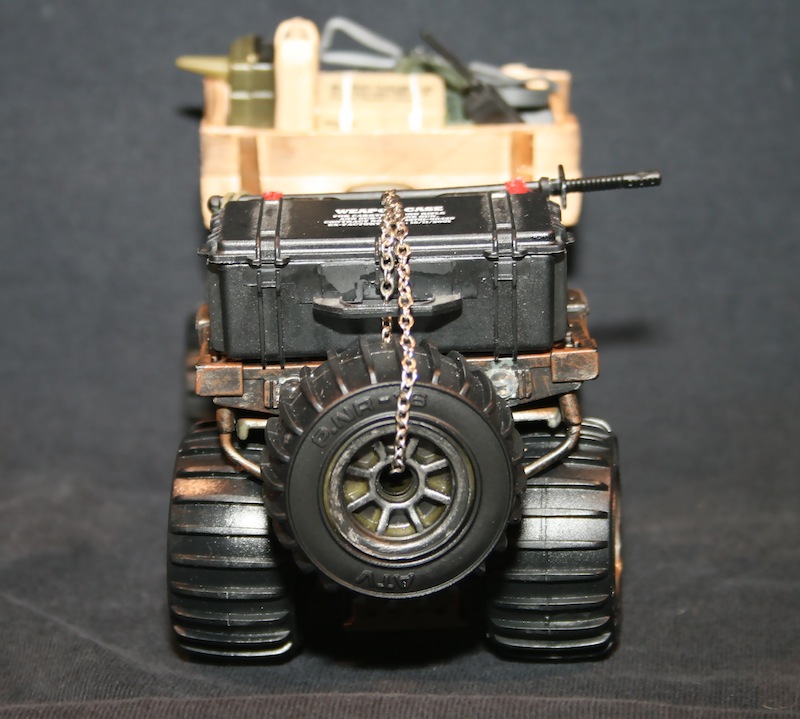 This was a tricky custom due to the LEDs (they're red up front) there is a battery hidden in the rear box under a false panel. The switch is the green jerry can. Had lots of fun making this.