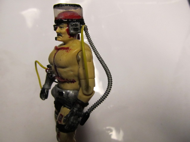 This is another one of my figures where I was not happy with the original. My original character was named weapon X. After redoing him I am very, very pleased. He is no longer weapon X, but Dr. Mindbender. I wanted to go for a look like Mindbender just got done with a surgical procedure done on himself. I made him a brain and used a small plastic piece to make the case. I then added the wires to make him look more robot than human.