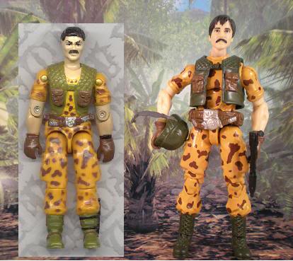 Special Mission Brazil Claymore! I actually did this project (including Mainframe and Wetsuit) before the last Joe Con Brazil set was shown. I much prefer the 80's versions, after all, that's what GI Joe is to me, the characters I loved as a kid. I have a Dial Tone started also. I tried to match the vintage camo pattern closely, and the details on the boots. The vintage figure used parts from Dusty, and sinice the 25th Dusty wasn't just recycling parts from other characters but actually had new parts produced for it, I went with those same parts for Claymore.