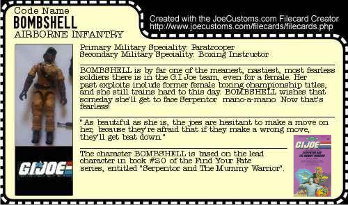 Bombshell is based on two concepts, first, from one of the Find Your Fate books, where the hero was named Bombshell - but I decided I want it as a female, and second, from a photo of a prototype black female Lady Jaye I saw years ago from yojoe.com.