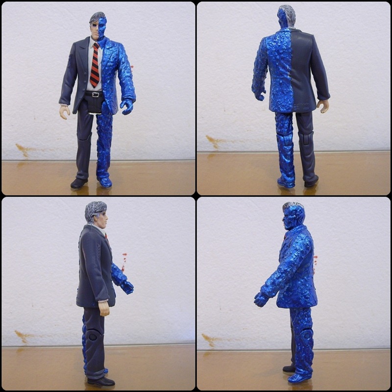 Immediately Two-face's figure came to my mind. I painted the part burned with a silver color and on it I applied a layer of translucent blue of Tamiya. The right eye is also painted in blue because I don't have translucent red color. The hair is painted with "Grey Wolf" and layers of "dry brush" black and grey colors.