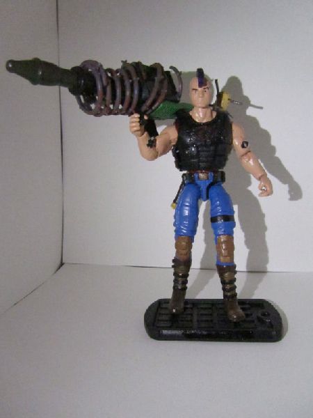 Just throwing parts together and decided to try to use that Ninja Force Zartan head. I also wanted to see if I could fuse a vintage style waist to a modern era torso, something I later tried again with my Reaper custom. I wanted to give him a heavy weapon and decided to do something with the Wild Bill launcher since it looked most like something that could pass as something that was cobbled together from various different missile launchers and pieces. It doesn't fire any more which is fine with me. The baseball bat was made by cutting down and reshaping some random missile I had and sticking bits of a paper clip in it.