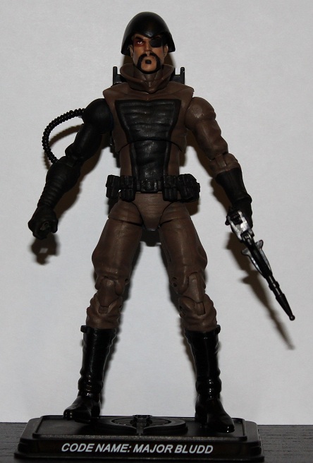 Major Bludd is a mercenary who generally works for Cobra. His real name is Sebastian Bludd. Born in Sydney, Australia, he served in the Australian Special Air Service Regiment and French Foreign Legion before working for Cobra. He is wanted for crimes on several different continents. He lost his right hand and left eye in battle and has a cybernetic arm. He typically wears the dog tags of his victims.