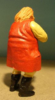 Taken from the comic book. The dress was painted in a metallic red to make it more lifelike. To help line up the figure with the artwork, I painted only simple dot eyes without eye makeup. The flesh tone is spray paint, which had to be applied in multiple layers, slopping out some details. To cheat around this, I painted in a few lost details, like the nostrils. To capture the buckled teeth look, I painted the sculpted lips as teeth and then framed them with red as lipstick. I also extended the width of the mouth to make it look wider and even more fishlike.