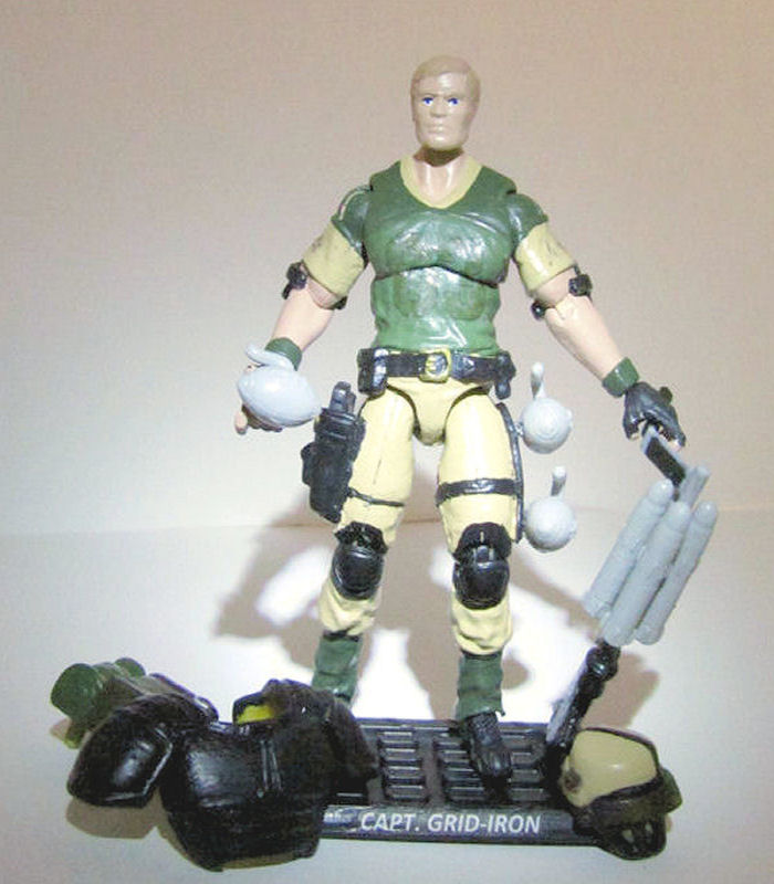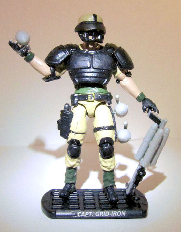 I know this character is far from realistic but I've always liked him regardless. When I decided to do a modern era version, I wanted to try and make him a little more legitimate but not loose his football connection. His filecard says that he was the quarterback for the West Point team so that's where I started, researching the uniforms. I found that their uniform colors were black and gold and while I figured the pants would work, I thought he wouldn't look much like Grid-Iron with a black shirt so I decided to compromise. I did some more searching and found a place that sells army licensed football jerseys and they had one that was green and gold, meant for infantry which I felt would be perfect for Grid-Iron, especially since Infantry is his secondary specialty. I also decided to paint his "pads" black to bring in more of the West Point football connection. I tried to use some water slide decals to put some numbers on his jersey (O3 which is his rank) but they didn't turn out as well as I hoped and just blend in with the jersey. Oh well. I figure it can be explained away as just being faded due to battlefield wear and tear over the years.