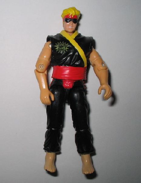 I needed a thin torso and the plain, black torso of Rapid Fire seemed appropriate. I then needed bare arms and with a Mortal Kombat movie edition Liu Kang torso available, I took those. The 2000 Destro waist matched the red of the uwagi and the Quick-Kick legs were obvious.