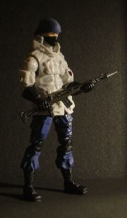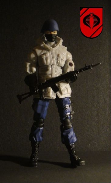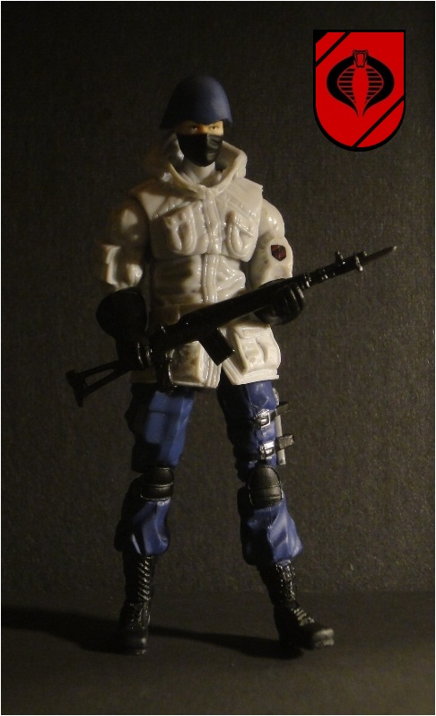 Although the blueshirt jumpsuit is their hallmark, when operating in winter conditions Cobra troopers need a modicum of comfort and camouflage if they are to be effective. The main element of this outerwear is the cold weather parka, issues in blue, and white for snowy environments. The jacket is designed with plenty of storage for ammunition and equipment and a hood compatible with the standard issue Cobra helmet.