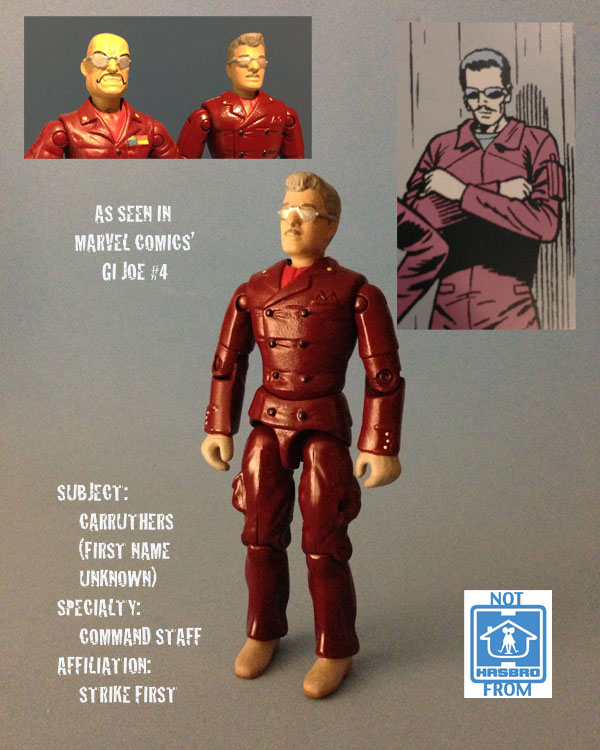 Carruthers appeared in Marvel's GI Joe #4 as one of the officers in Vance Wingfield's "Strike First" militia. Unlike the Wingfields, who wore fatigues, Carruthers wore a poorly-designed (or maybe just poorly illustrated) uniform that was a nasty combination of a zoot suit, coveralls, and a flight suit- depending on which panel is viewed.