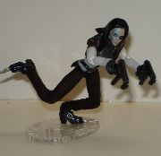 This was my first attempt at Domino, a favorite character of mine from the pages of X-Force and X-Men. It was a time of experimenting with different types of fodder and materials for me. The 'clothing' on the torso and legs is different types of party balloons. For a time I was really working with using balloons as clothing as a technique, but they just proved to be too difficult to work with. And I discovered, they don't last at all. The rubber I used on this figure sort of... melted. So I don't even try it anymore. This was done for a 'Mercenaries' No Joe Challenge.