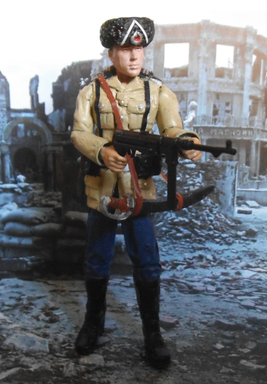 Cossack, von Jungschultz Cossack Regiment, I Panzer Army, XXXX Panzer Corps 1942 - 1943. This figure came from a conversation I was having with a friend who is interested in World War 2 history. We were discussing the direction my customs were taking, and the fact that most toy companies only seem to trot out the same German and American army figures time after time. I started thinking about the auxilliary units that the German amry used, and their allies. I immediately thought of the Cossacks and started to do some research. I found the uniform specifications for this particular look and put the parts together in my head. I went for the RoC Duke head as he has a slightly Eastern European look that I was aiming for.