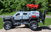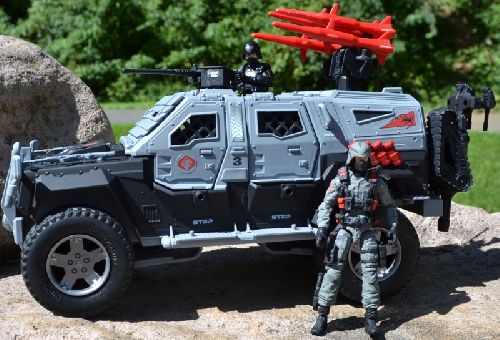 I know I'm late to the party on converting the Combat Cruiser to a Stinger, but it just took me a long time to get around to it. I made the Stinger driver some time ago and he now, finally, has a ride. I made multiple changes to make it more Stinger like. This included converting a vintage missile rack to fit in the existing turret, as well as adding armor to the front using styrene and the armor from the ROC Steel Crusher. The metal grating in the windows is made from the hangers that Hanes socks come on. The wheels were cut axel and all from a Bruder Jeep and made to fit. The 50 cal gun on top is a cast. Drones were added to the back and made to be removable to add play value.
