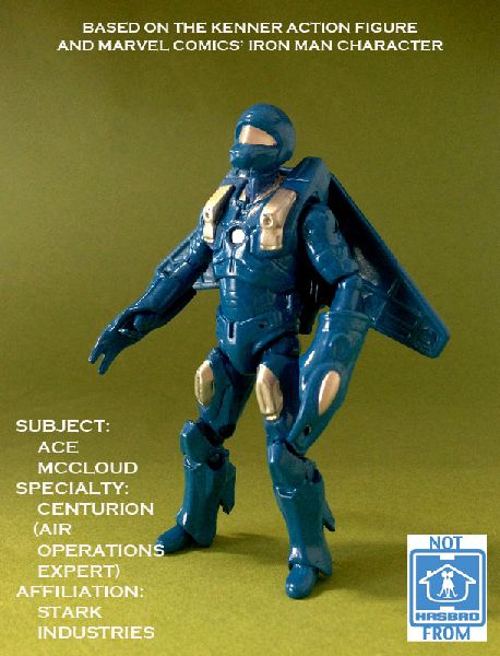 The Iron Man action figures are a given to use for base figures. I bought the three cheapest Iron Man figures I could pick up, which happened to be three of the same figure- the Inferno Mission Iron Man. Instead of trying to make each of the Centurions have different uniforms, they're essentially the same, though I mixed in a few different pieces so they're not carbon copies of each other. In this case, the lower arms/hand and feet have replaced the Iron Man ones. The forearm/hand gauntlets have a certain avian feel to them, perfect for the flying Centurion. Likewise, removing the shoulder pads and replacing the bulky feet with much smaller ones makes the character appear lighter. The Major Hawk Masterson jetwings round out the design.