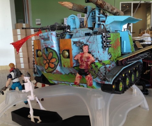 Of course Misery Inc., wouldn't be complete without their Misery Machine, inspired by the internet image of Velma & Scooby in front of the zombie-hunter inspired version of the classic cartoon vehicle. In my case, I went with a GI Joe Warthog to represent the classic van. I added a number of zombie fighting additions to the vehicle, including a flame thrower, barbed-wire, a police shield with the classic tire motif on it, a net zombie-blocker net on the back, four chainsaws, a couple giant wooden stake 'missiles' on top, a couple machine guns, and a hanging zombie figure, courtesy of drbindy to ward off the undead. This vehicle and figure setup won first place in the vehicle competition at Assembly Required 2014.